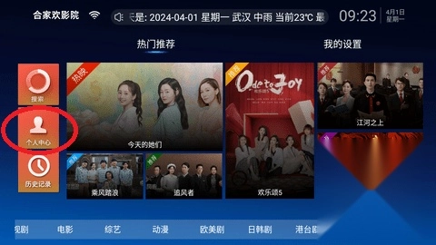 1、打开合家欢视频,在首页点击中间位置的“个人中心”按钮。
