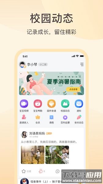 该应用专注于幼儿教育领域的深度发展,致力于构建家园协同教育的平台;它具备宝宝视频观看、校园动态实时更新、考勤与请假管理、每日食谱查询以及即时消息推送等多项功能。