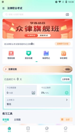 律学法考是众律智学教育咨询(北京)有限公司为法律学习从业者打造的综合学习平台,集听课、学习、备考等功能于一体,提供丰富的在线课程和智能题库练习服务。用户能轻松获取专业导师亲授的课程讲座,实时学习优质法律知识;平台还拥有各类专业题库资源,用户可根据自身水平自由训练,直观发现学习弱点,从而更有针对性地巩固提升。