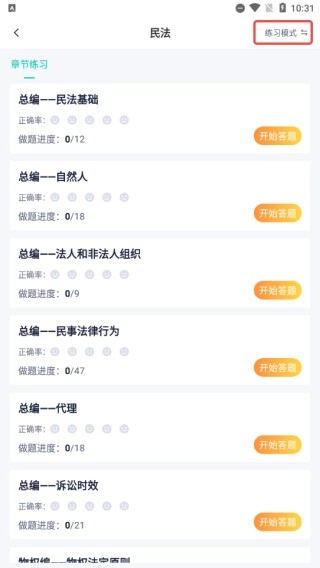 4、点击右上方可切换联系模式、背题模式、考试模式三种模式,可根据自身需求选择模式开始答题;