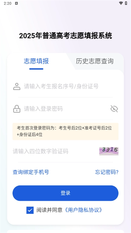 需要输入考生报名号等相关信息来登录后即可进行志愿填报使用。