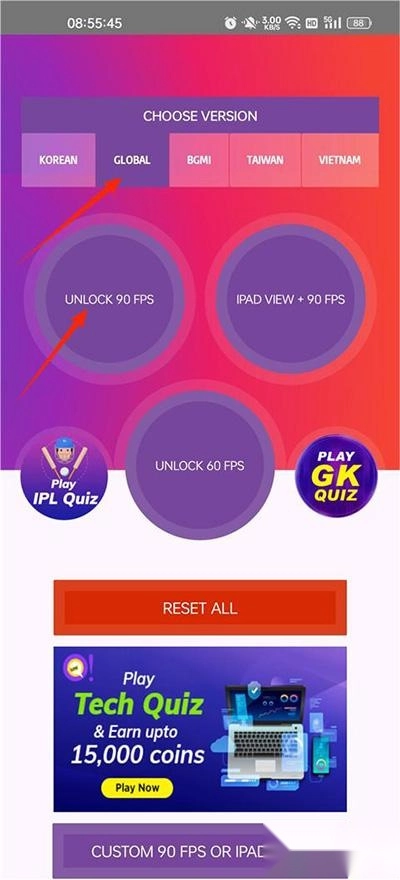 1、打开软件,选择全局模式global,再点击解锁90帧模式。