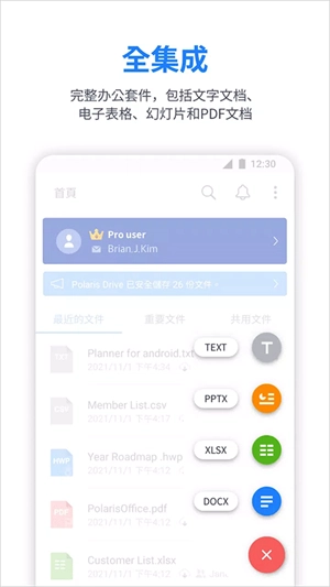 借助PolarisOffice,您能够打开并编辑各类商业格式的文件,像MicrosoftOffice、PDF、ODF以及TXT等都包含在内。