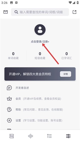2、进入该界面后,点击【点击登录/注册】按钮,可进行账号登录操作,同时能查看会员等相关功能入口。