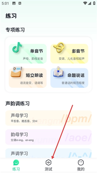 1、进入【练习】界面,选择【单音节】下的【声母、韵母发音】等专项练习,先把声韵调的基础打牢。