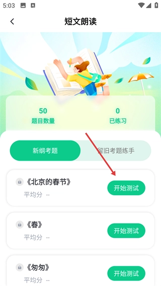 4、进入【短文朗读】页,点击【《北京的春节》】对应的【开始测试】,完成指定篇目练习。