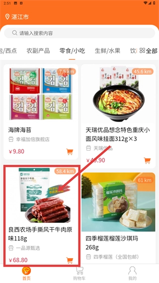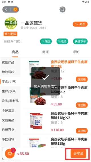 2、在优选商品页,选择目标商品(如良西农场手撕风干牛肉),点击进入该商品的详情页面。