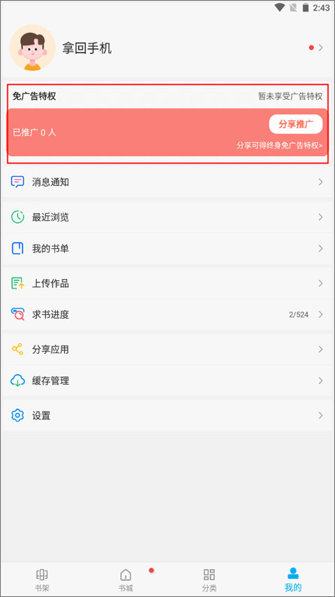 1、打开应用并进入主界面后,先点击下方的【我的】按钮,接着看到上方有特权的提示,再点击上方的分享推广选项。