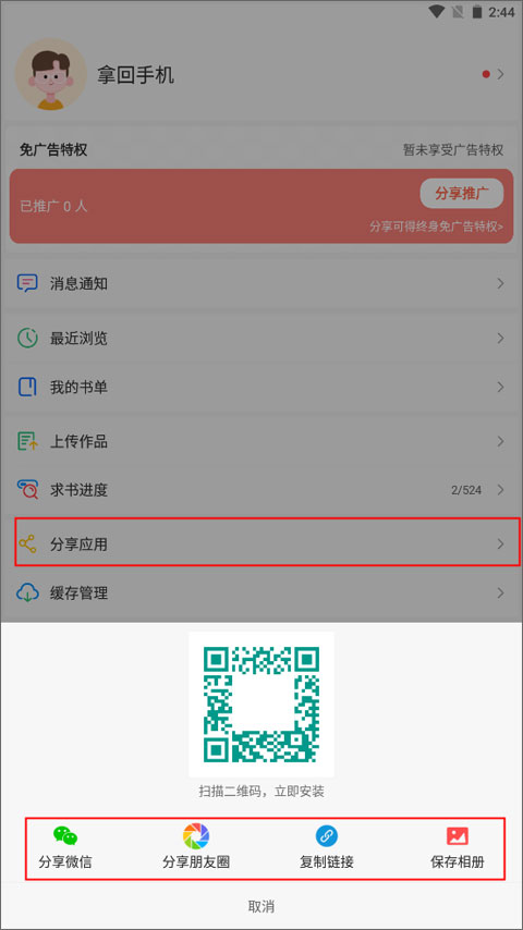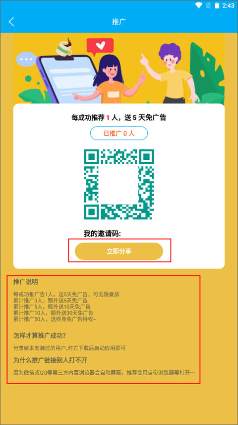 2、当你的推广人数达到一定数量,就能获得永久的特权,通过扫描二维码的方式就能成功推荐1人。