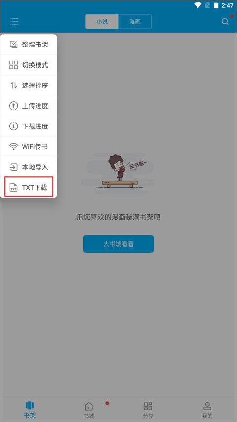 1、点击底部菜单栏的【书架】,即可查看书架上的小说与漫画,之后点击左上方的【≡】按钮。