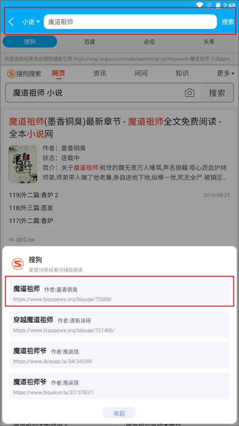 3、此时页面会跳转至网页界面,通过搜索关键词找到目标小说后,点击对应的网页即可。