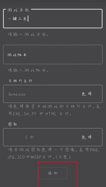 7、确认所有信息输入无误后,点击“添加”按钮完成游戏导入。