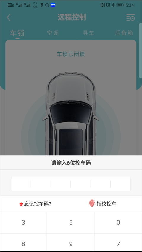 步骤三,通过手势左右滑动,选择需要进行的远程控制的功能,点击相应按钮,输入控车码,即可完成控车。