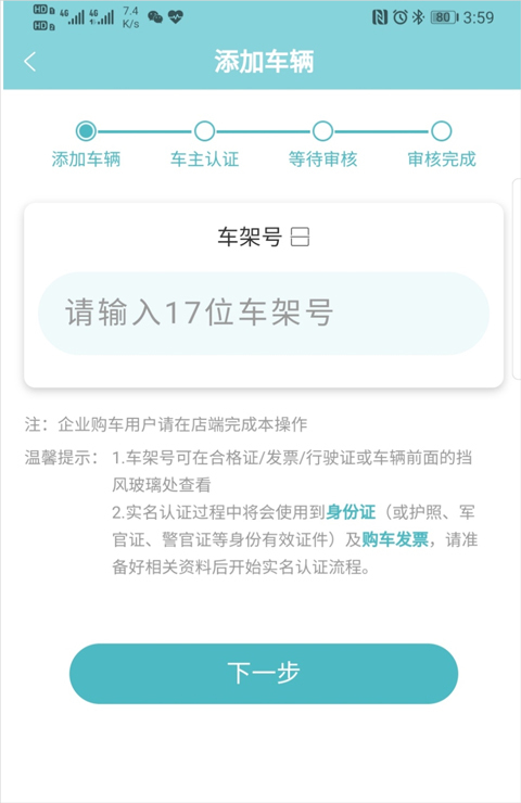 步骤三︰进入"添加车辆"页面,按照页面提示,输入车架号和发动机号,进行车辆认证