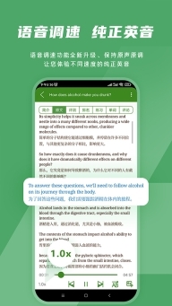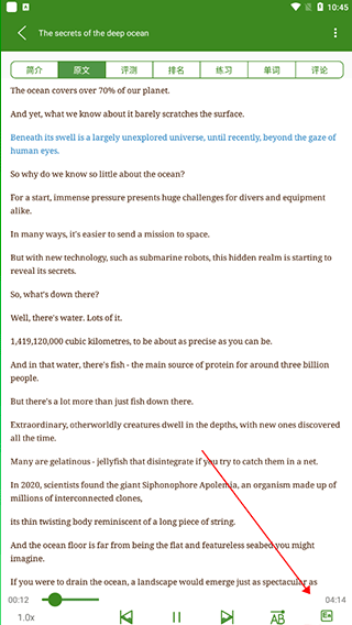 2. 软件的强大之处便在于此,它支持在线播放原文,让你能对照中英文去理解文章含义。而且,你还能够选择隐藏中文,仅显示英文。