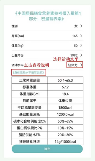 2、请填写性别、身高、体重、出生年份等基础信息。接着,点击“身体活动水平填写说明”,依据表格内的信息,选择自身的身体活动性水平。
