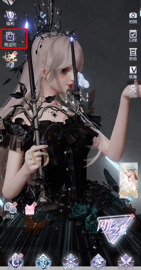 1、打开游戏,游戏内如图,点击左侧商业街,或者上方钻石旁的+号;