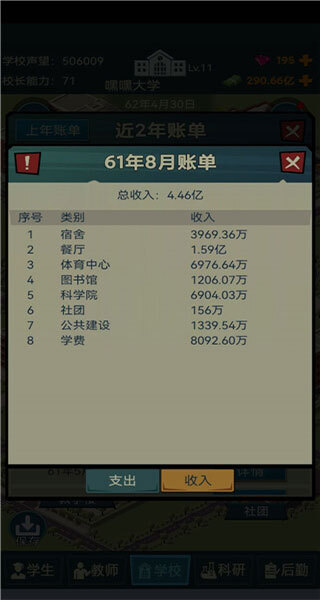 5、前期的钱丢在新建和升级教学楼(看着你的学生人数来)、办公楼(两栋其实也够了,自己看着来)、食堂(财务自由的关键)、图书馆(按升星要求操作)