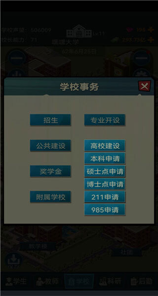 4、下面讲讲事务功能里的内容。在事务方面,招生规模全部拉到最低,毕竟赚钱才是重中之重。专业开设直接全部购买,因为资金是够用的。学校活动一定要刚进入游戏就点击开启,不然玩到后面才发现这个功能,那学校升级速度就跟乌龟爬一样慢,这可不是开玩笑的。奖学金等玩上几年后再使用,咱们得存钱。公共建设同样在开局就着手进行,但摆渡车不要投放,开局投放摆渡车很亏钱。直接进行扩建,然后持续建造新的公共建设并不断升级,就这么一直建一直升,这在前期可以说是保障发展的关键。要时不时查看升级学校和高校建设所需的条件(升级学校的条件直接点击最上方的白色学校图案就能看到),时刻紧跟游戏发展形势,别光一门心思赚钱,却一直停留在低等级。