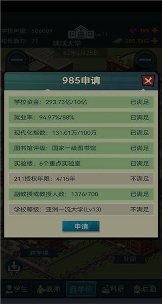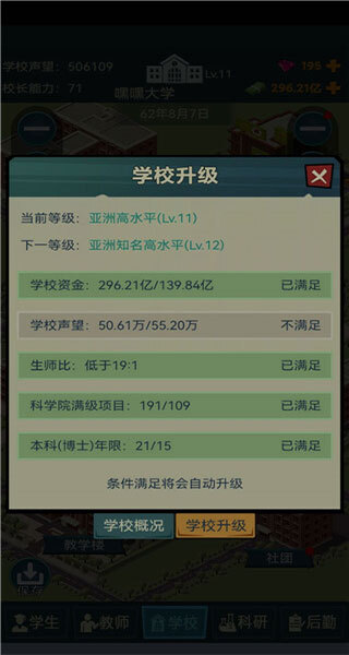 9、点击学校,玩家的目标是成为世界一流名校,点击学校查看学校概况及升级条件;