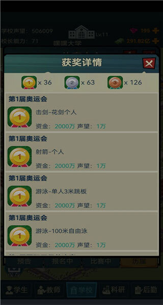 中期声望主要靠奖牌,你瞅瞅,一个奥运会金牌就送2000万奖金和10000声望,上面学校活动满级加起来送的声望还没这金牌高,这也就是为啥要尽早筹备,我现在卡手也是卡在声望,体育中心太晚弄了