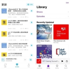 对软件与苹果播客平台Podcasts展开对比研究——“发现”信息流标签以及“我的播客”订阅流标签,分别与“Browse”和“Library”相对应;软件把“Search”整合到了“发现”界面的顶部;“Listen Now”不再单独设立标签,点击底部栏目上方的播放器横条,就能跳转至播放界面。