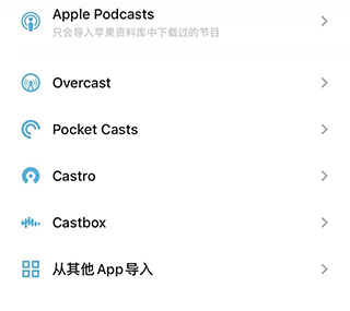 “我的播客”标签作为个人订阅内容的入口,用户首次使用时,可选择“从其他平台导入” ,后续在“个人”标签的设置里,同样能选择“导入节目” 。当前软件支持从Apple Podcasts(仅导入苹果资料库中已下载的节目)、Overcast、Pocket Casts、Castro、Castbox等平台导入,也能通过拷贝opml文件实现从外部文件导入。