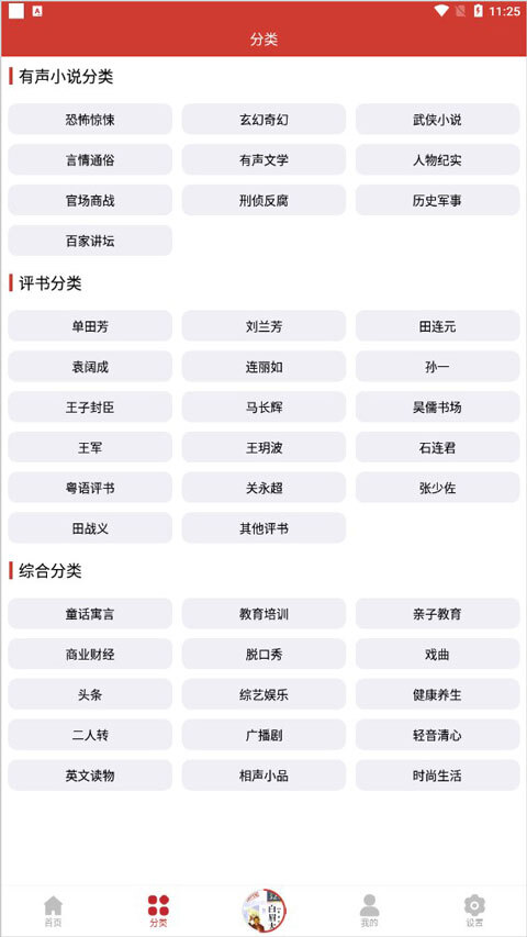 2、借助分类查找:点击底部的“分类”,“评书分类”就会呈现出来,依据个人喜好与需求挑选评书讲解员。