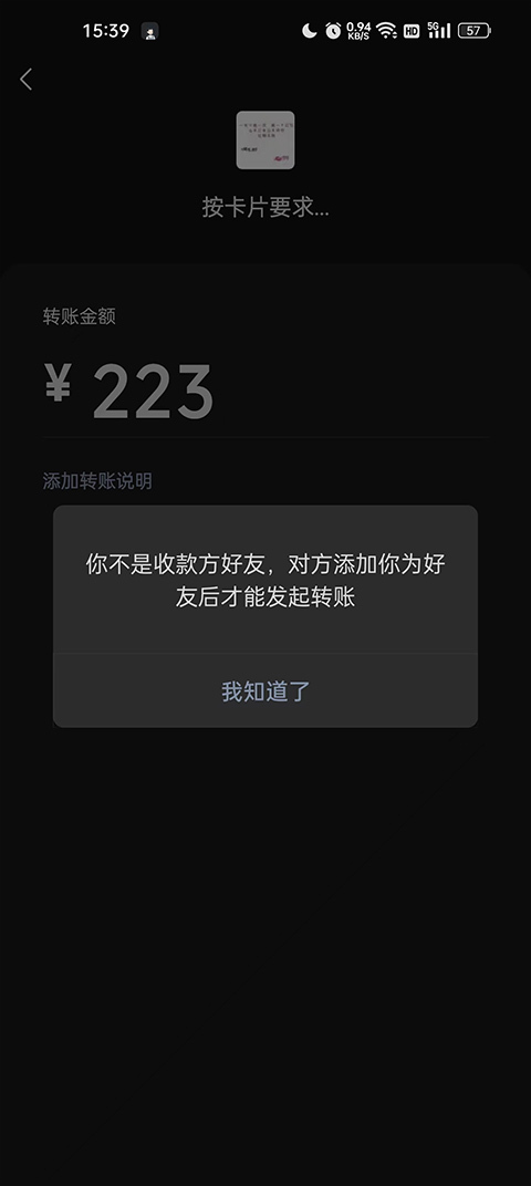 3、具体操作流程为:在转账页面输入任意金额,接着点击转账(此操作不会产生扣费)。若这时出现提示“你不是收款方好友,对方添加你为好友后才能发起转账”,那就表明我们已被对方删除。