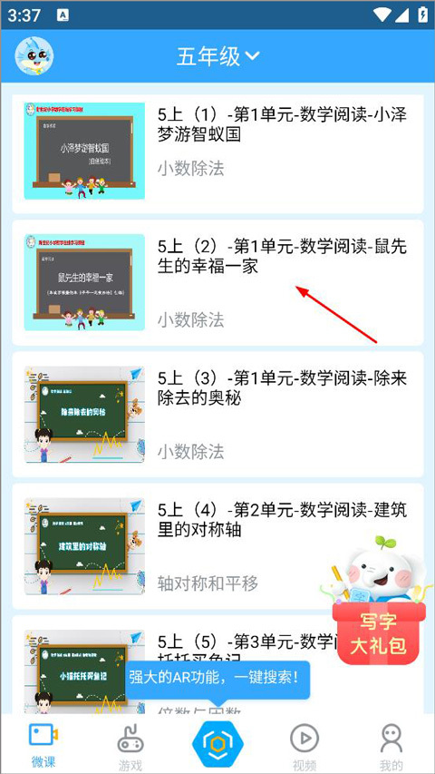 1. 用户开启并登录新世纪学生版app,进入微课界面,在此界面中,用户能够学习数学阅读小故事,随意挑选一则故事点开。
