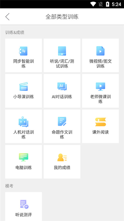 2、点击进入训练后,这里为用户准备了同步智能训练、AI对话训练、老师微课训练、人机对话训练以及听说测评等多种功能。用户只需随意点击自己想要的训练内容,就能开启训练学习之旅。
