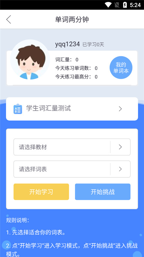 4、在单词两分钟环节,用户能够挑选自己想要的教材与词表,随即开启单词学习,也可进入单词挑战。