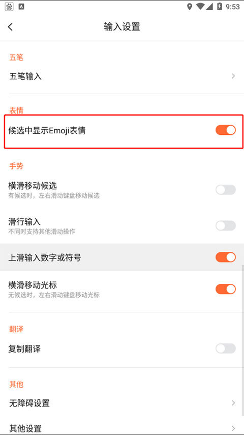 在输入设置页面将候选中显示Emoji表情开关打开。