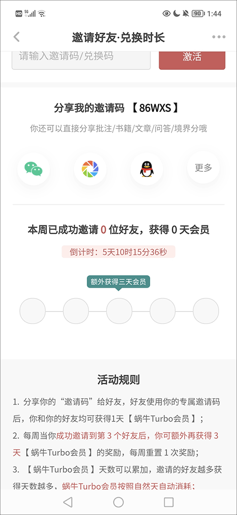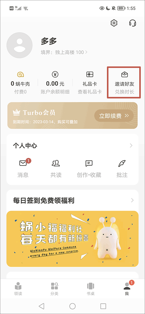 要是不想花钱,其实也有办法获取阅读时长,那便是邀请好友。在个人中心利用邀请好友功能分享邀请码,每成功邀请1位用户,就能获得1天会员,进而解锁相应的阅读时长哦!